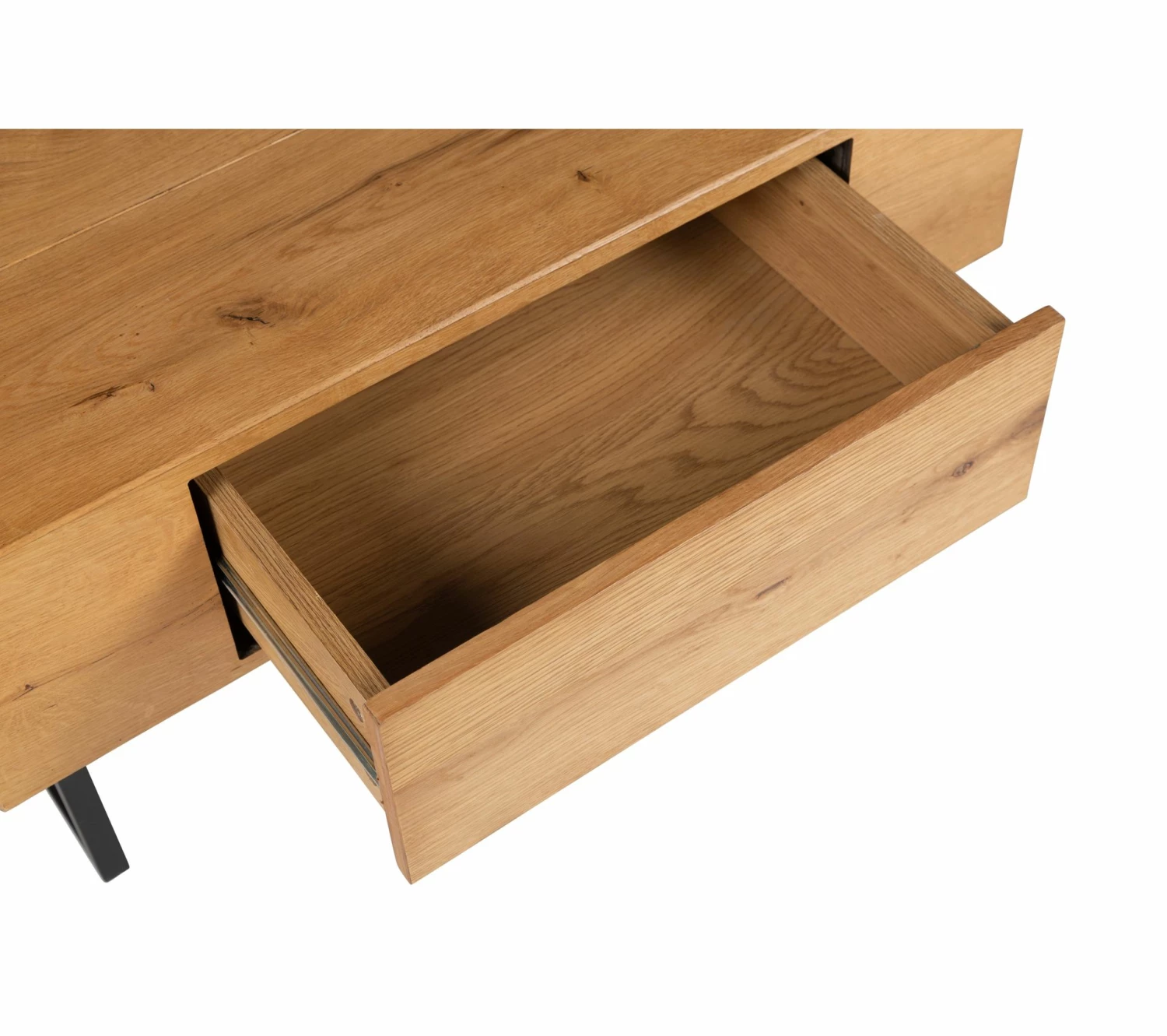 - Structure caisson en panneaux de fibres de densité moyenne plaqué chêne (plateau, sections longues, façade de tiroir)