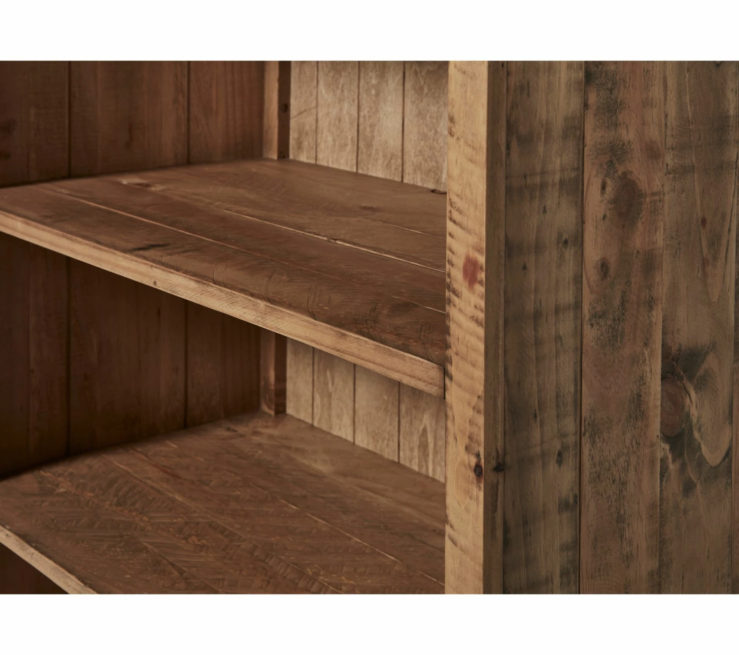 - Structure Dessus, côté et façade en Pin recyclé, Fond intérieur et étagères en bois de panneau de fibre de moyenne densité.