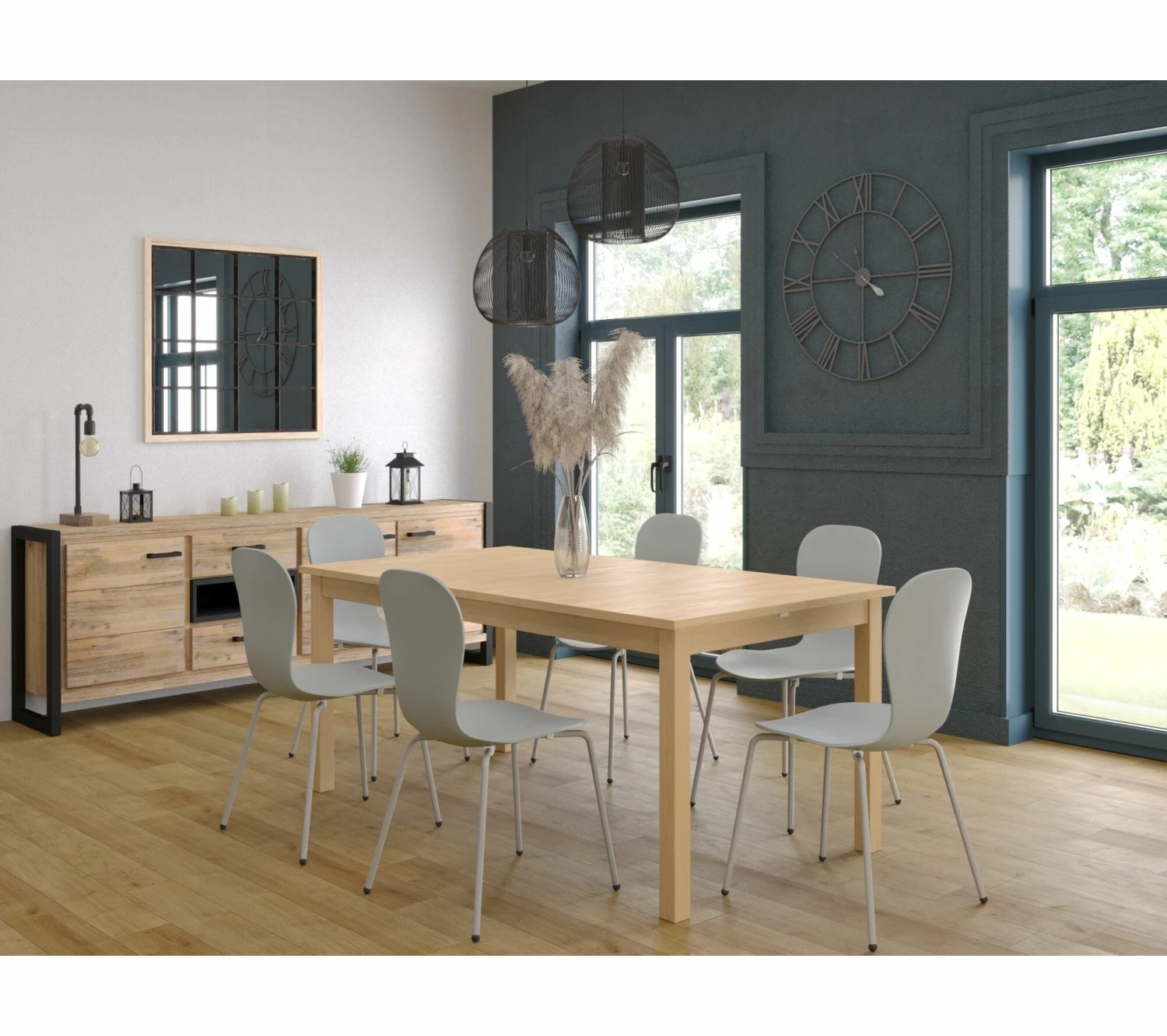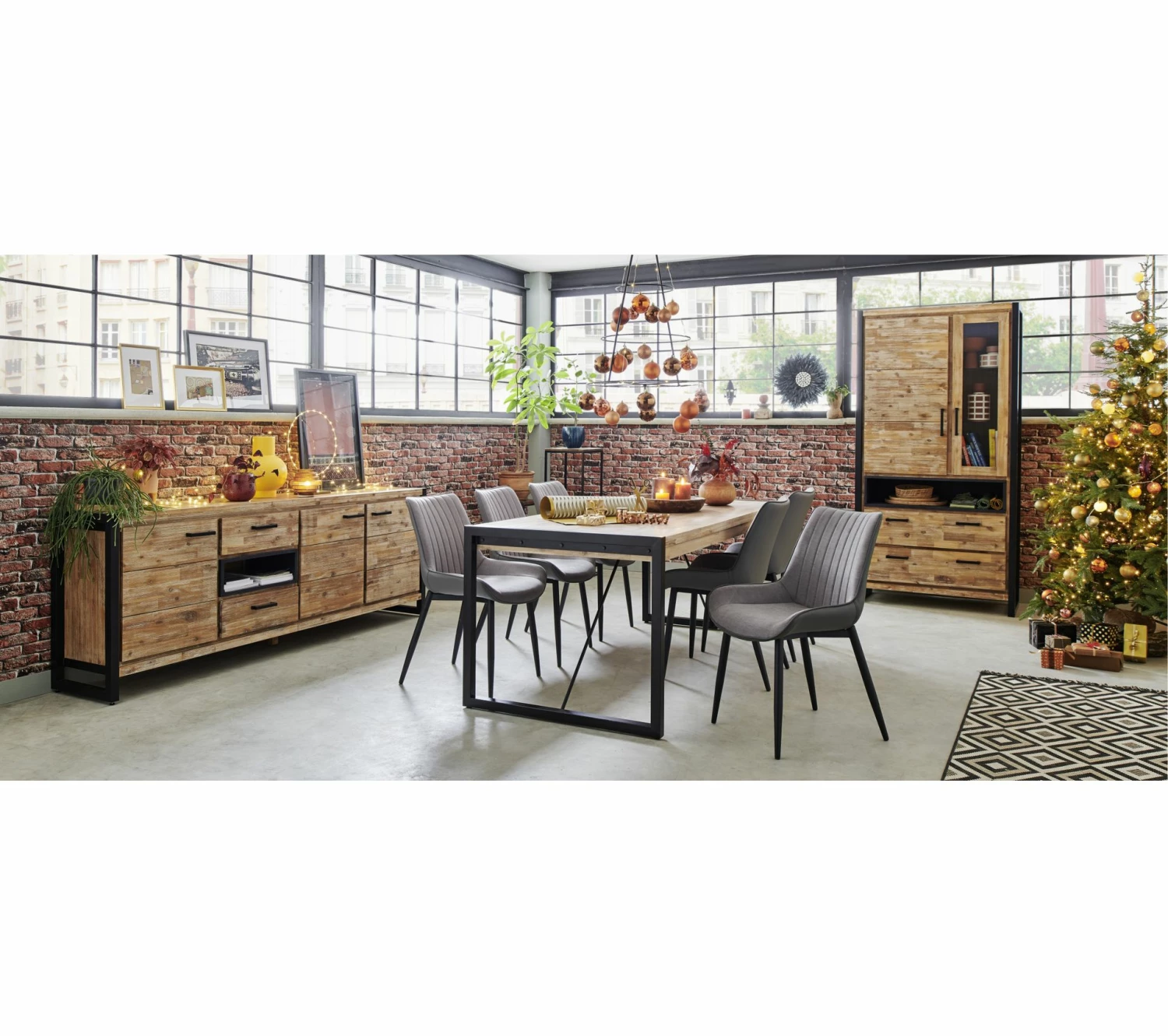 On aime beaucoup la patine de ce buffet en bois naturel, qui arbore un coloris chaud et élégant. Pour ajouter de la profondeur, les bordures et les poignées sont en métal peint en noir, un matériau qui rappelle le design industriel. Ce buffet s’assortit facilement à la grande table à manger de la même collection.