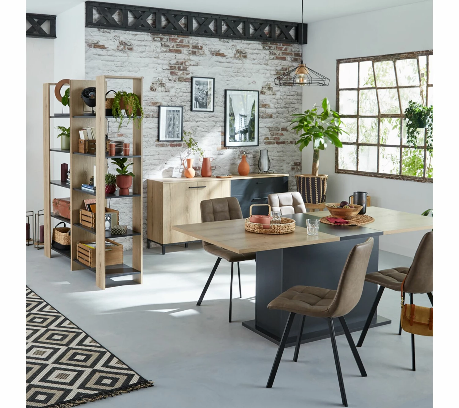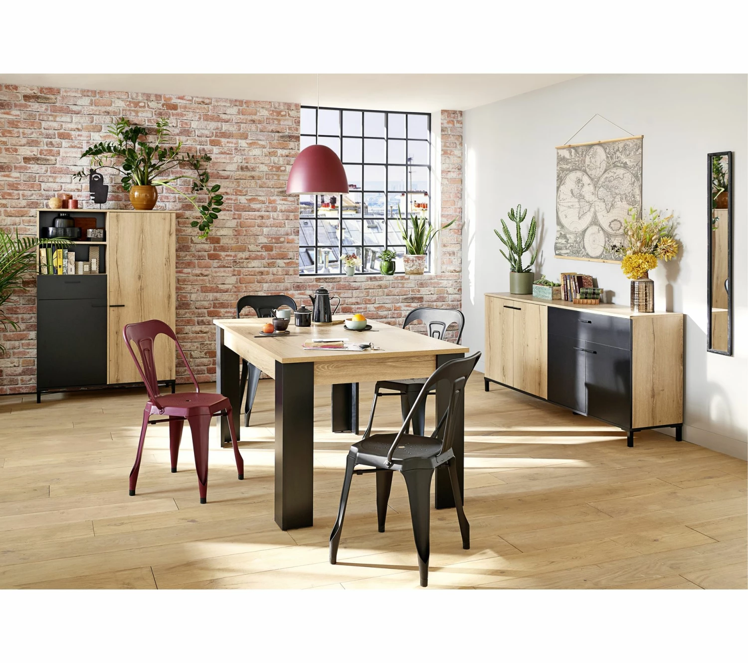 Inspiré des meubles d’atelier, ce buffet 4 portes/1 tiroir se caractérise par une structure revêtue de papier décor imitation chêne helvézia qui vient contraster élégamment avec les deux portes revêtues de papier décor noir. Esthétique et moderne, ce buffet imitation chêne et noir conférera un style industriel à votre intérieur.