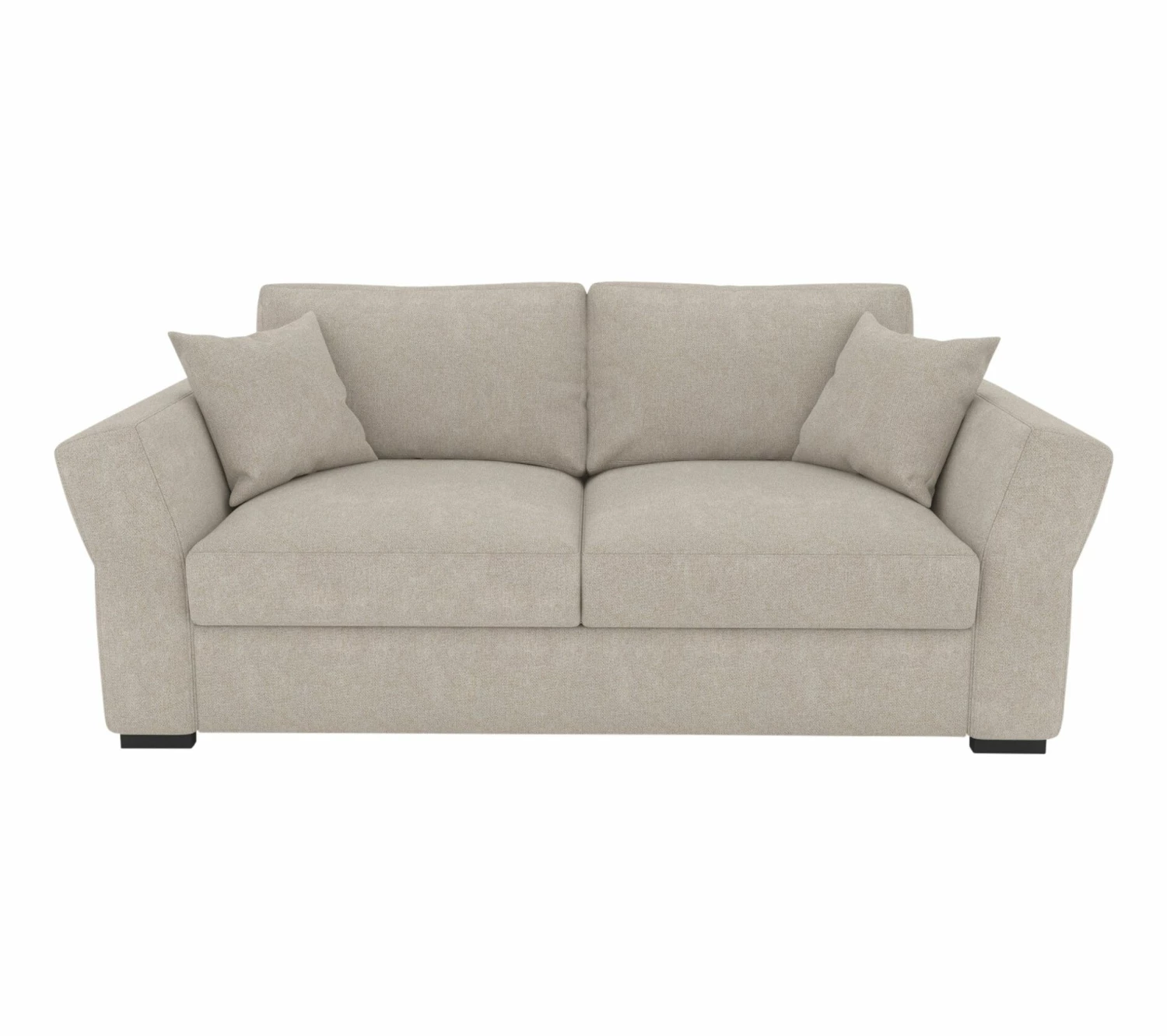 Ce canapé 3 places offre un grand confort. Son assise est en mousse polyéther d’une densité de 28 kg/m3 et son dossier intègre 25 % de plumes de canard, pour un effet ultra moelleux. Les petits coussins décoratifs sont livrés avec ce canapé beige.