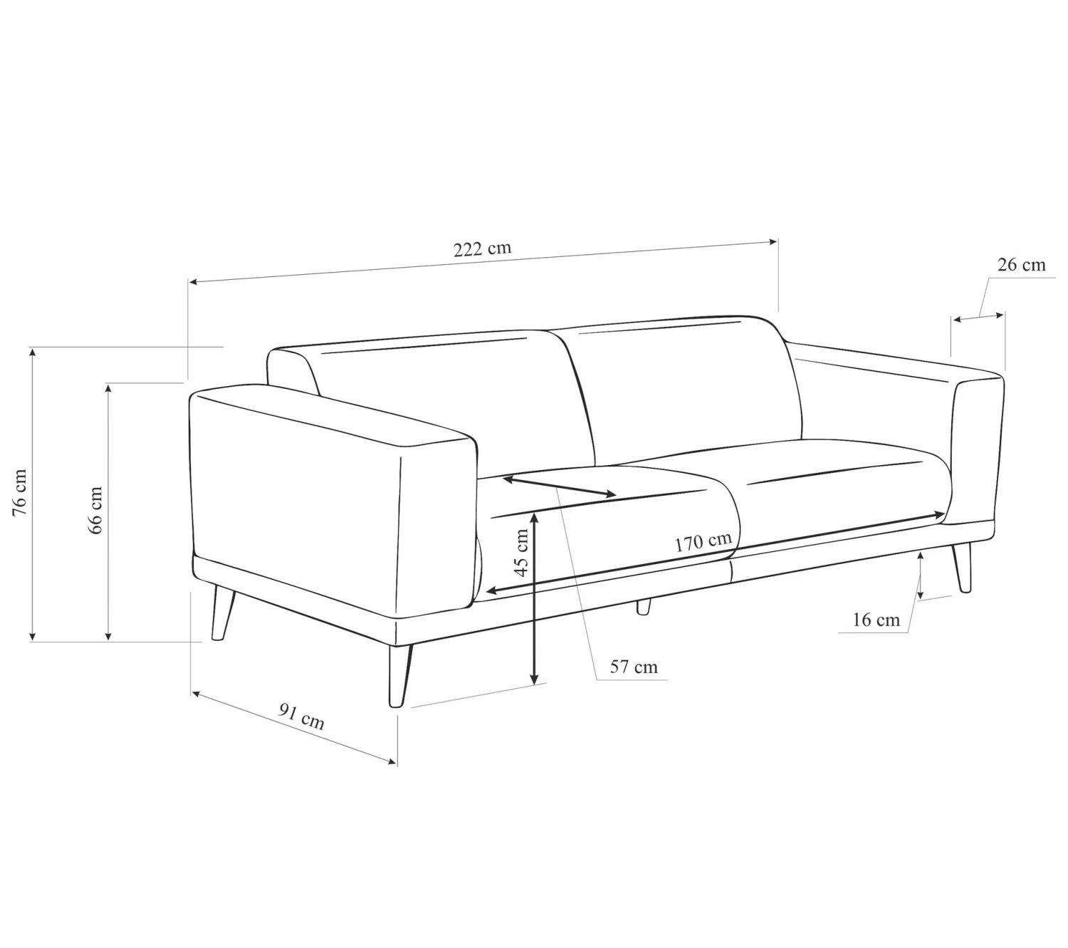 - Dimensions en cm L. 222 – H. 76 – P. 91.