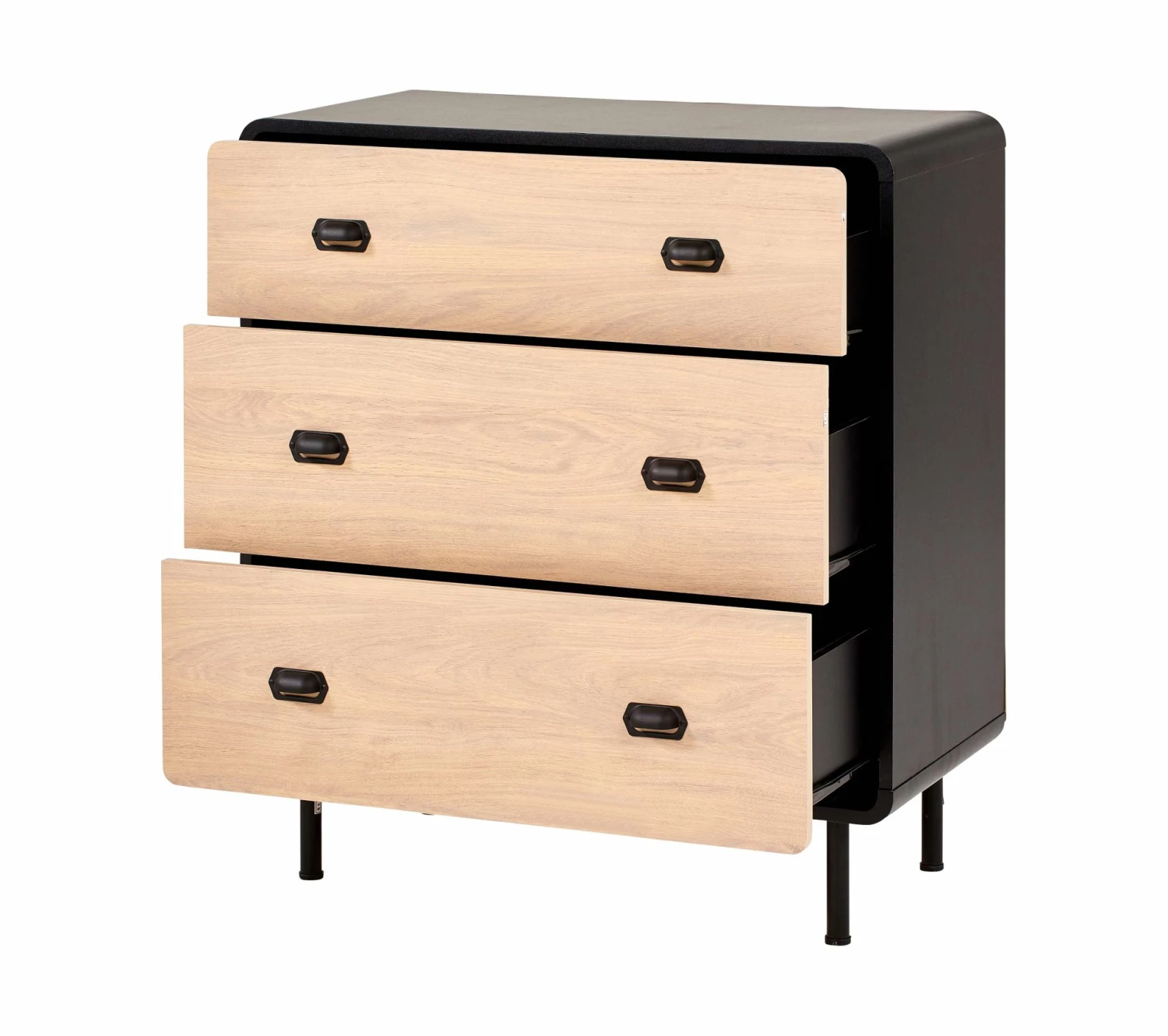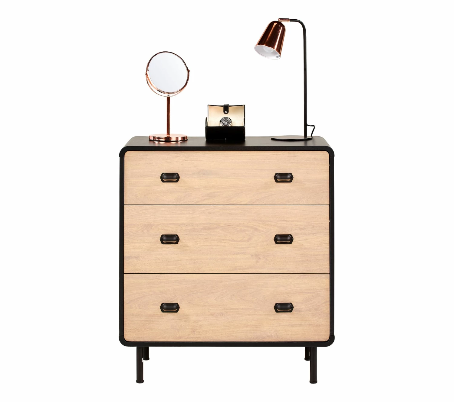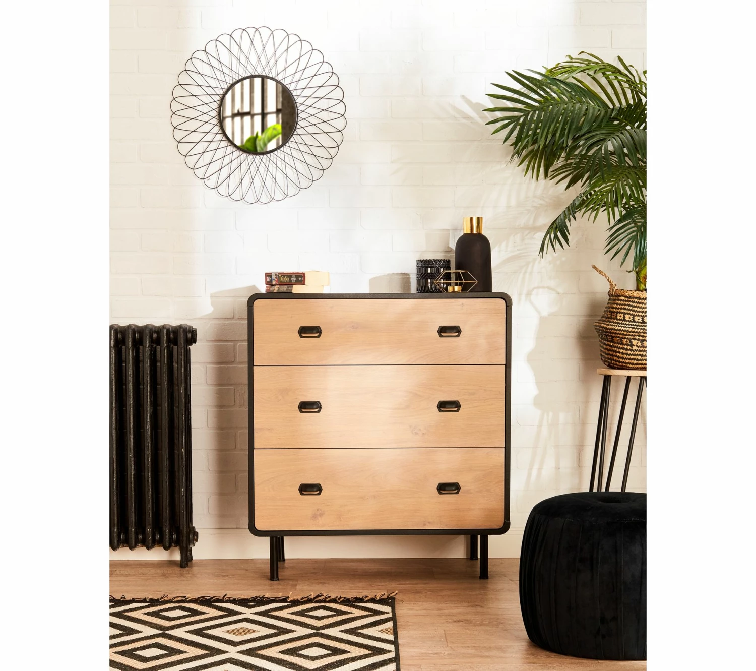 Que ce soit pour meubler un salon, une entrée ou encore habiller une chambre avec caractère, cette commode offre un beau volume de rangement. Pratique, elle dispose de trois tiroirs profonds et d’un plateau noir élégant sur lequel poser des objets de déco chinés, une mappemonde rétro ou encore un luminaire. Les dimensions de cette commode de L. 79 x H. 87 x P. 39 cm en font un mobilier de faible profondeur idéal pour investir toutes les pièces sans les encombrer. Facile à nettoyer, il suffit de passer un chiffon en microfibre pour l’entretenir.