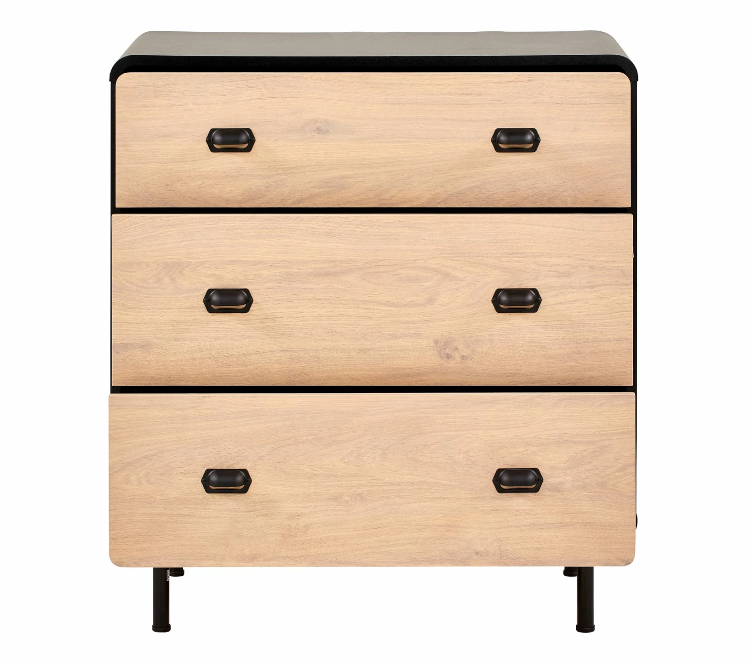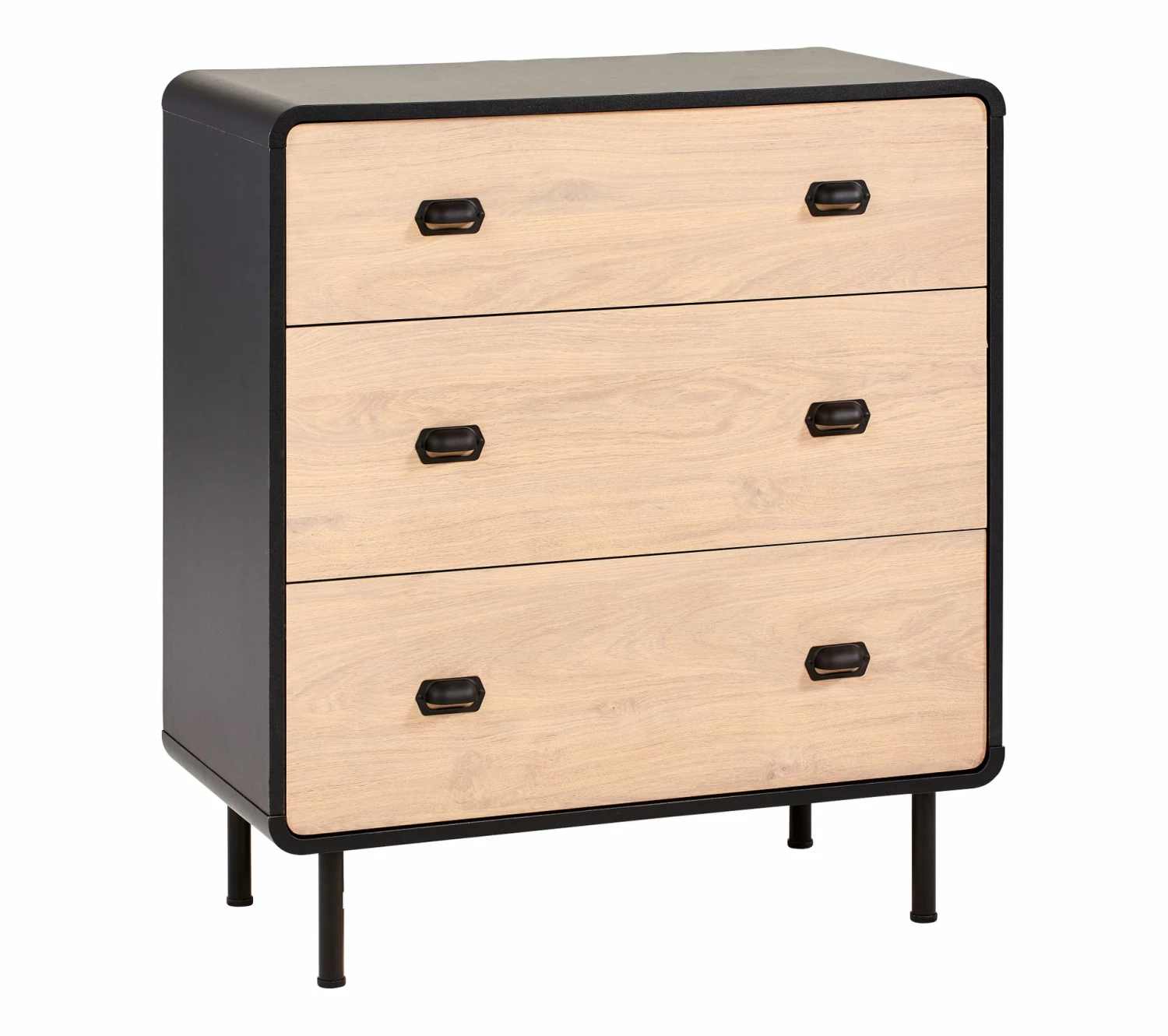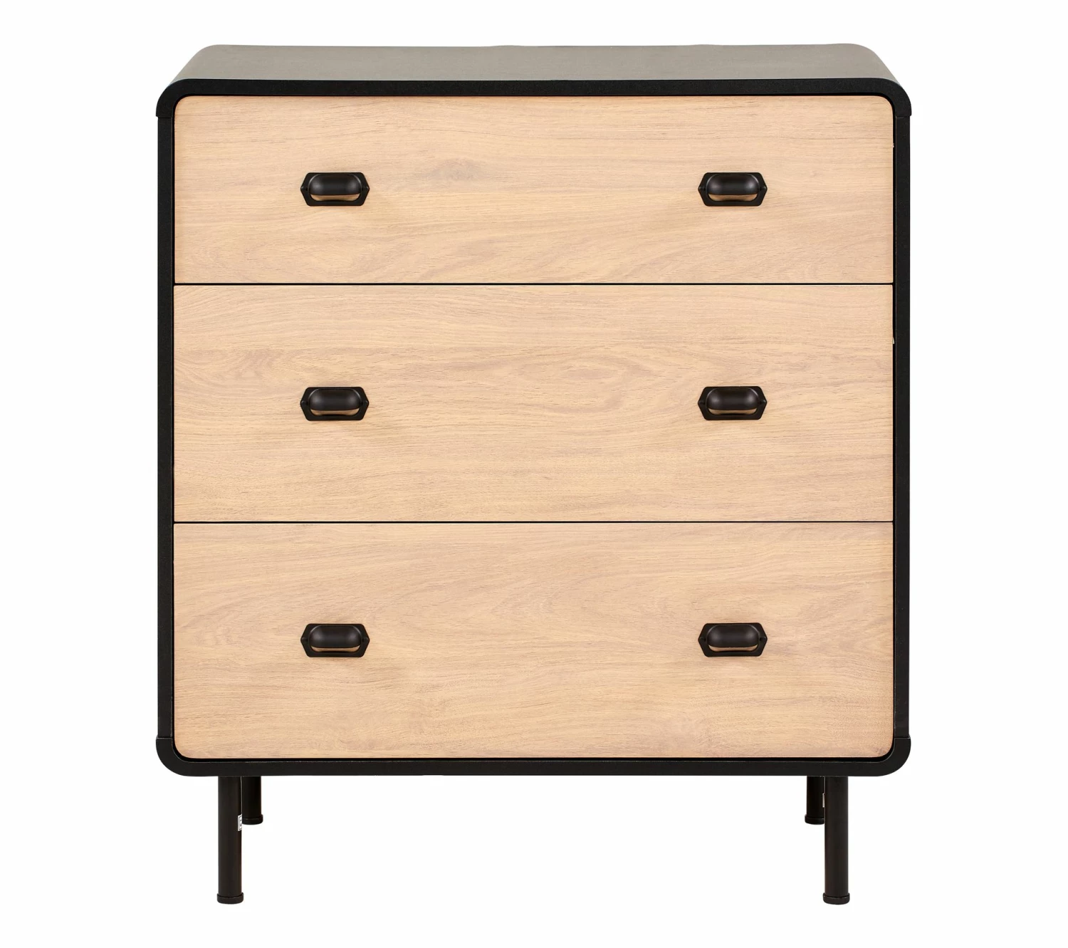 Que ce soit pour meubler un salon, une entrée ou encore habiller une chambre avec caractère, cette commode offre un beau volume de rangement. Pratique, elle dispose de trois tiroirs profonds et d’un plateau noir élégant sur lequel poser des objets de déco chinés, une mappemonde rétro ou encore un luminaire. Les dimensions de cette commode de L. 79 x H. 87 x P. 39 cm en font un mobilier de faible profondeur idéal pour investir toutes les pièces sans les encombrer. Facile à nettoyer, il suffit de passer un chiffon en microfibre pour l’entretenir.