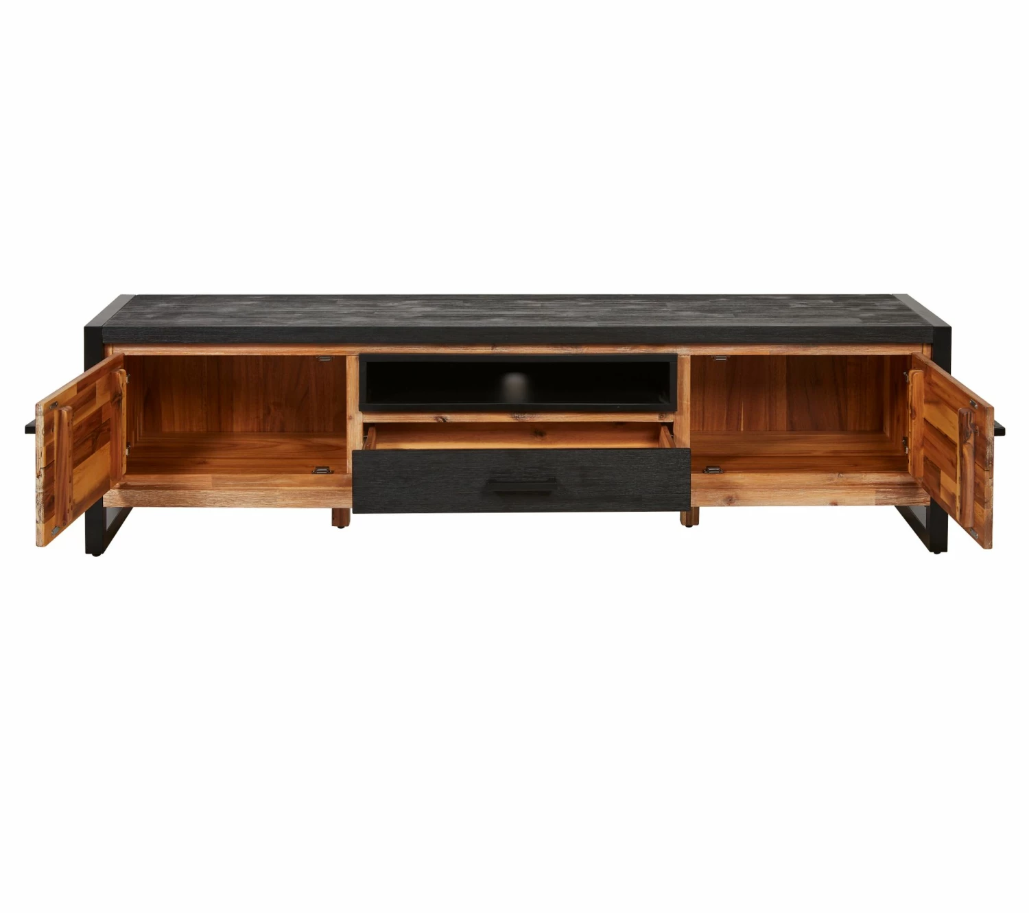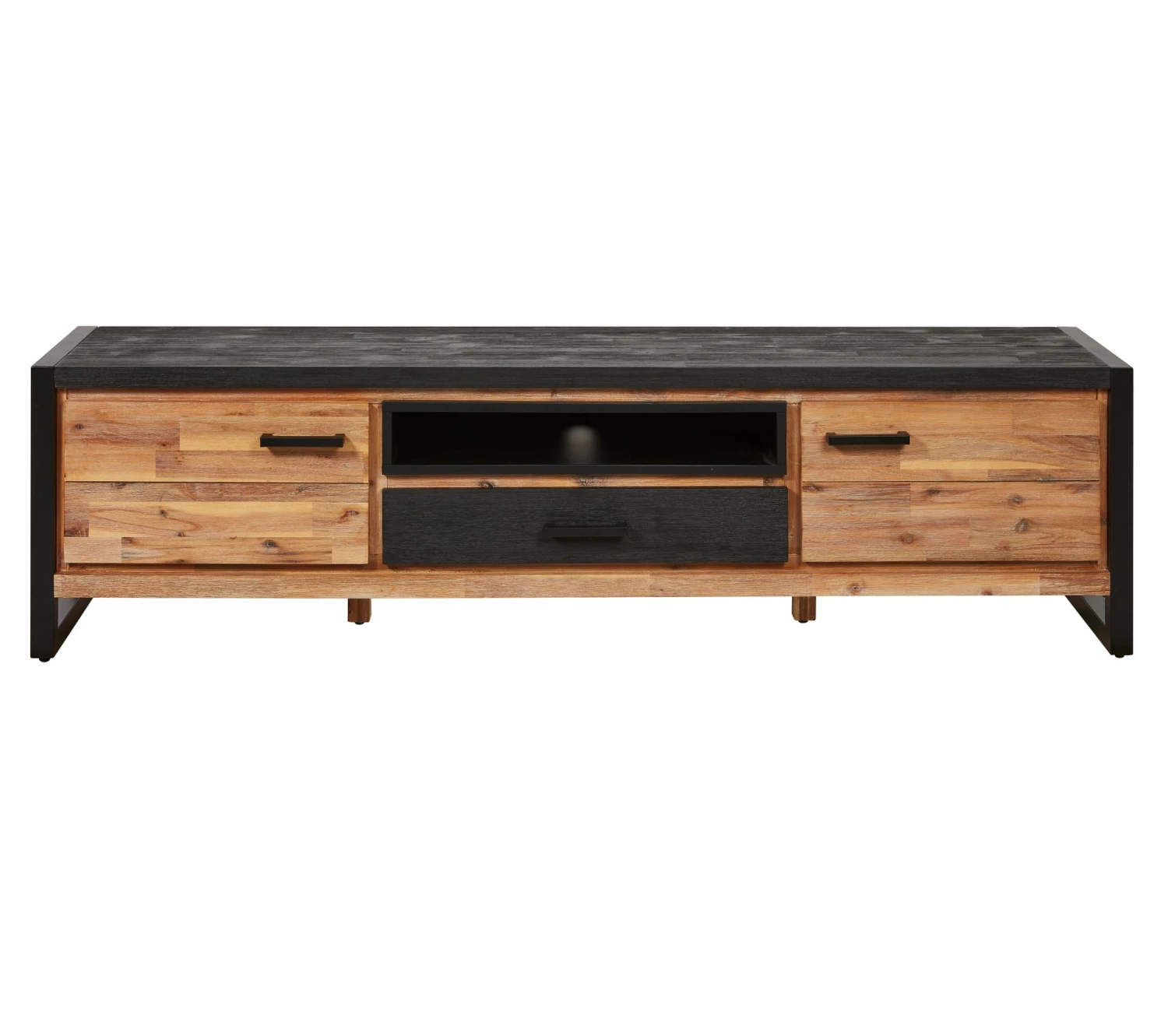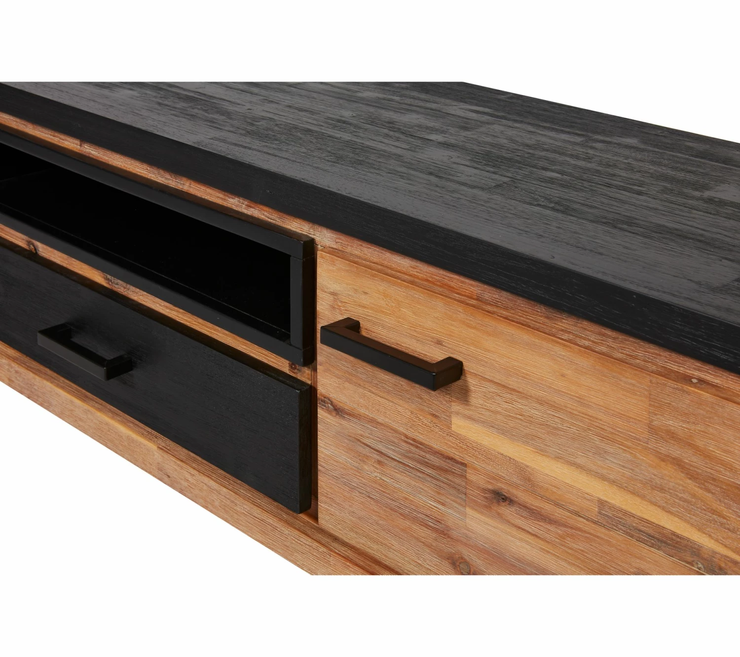 Meuble TV industriel tendanceTransformez votre pièce avec ce meuble TV élégant, en bois naturel et bois peint en noir. Bas et droit, ce meuble TV industriel apporte du caractère à votre salon. La couleur de son encadrement en bois est reprise sur le tiroir, la niche et les poignées des portes, formant un contraste du plus bel effet.Facilité de montageLivré en un seul colis, ce meuble TV droit est facile à monter. Son montage est rapide et demande peu d’outils. Dans la notice fournie dans le colis, vous trouverez toutes les indications pour assembler ce meuble TV de 190 cm de longueur, 50 cm de hauteur et 42 cm de profondeur.Grand meuble avec rangementsCe long meuble TV en bois possède plusieurs rangements pratiques. Il est muni de deux portes, d’un tiroir et d’une niche. Sur le fond de ce meuble TV avec tiroir, des trous sont prévus pour le passage des câbles. Ce meuble TV noir et bois naturel offre un excellent rapport qualité/prix.