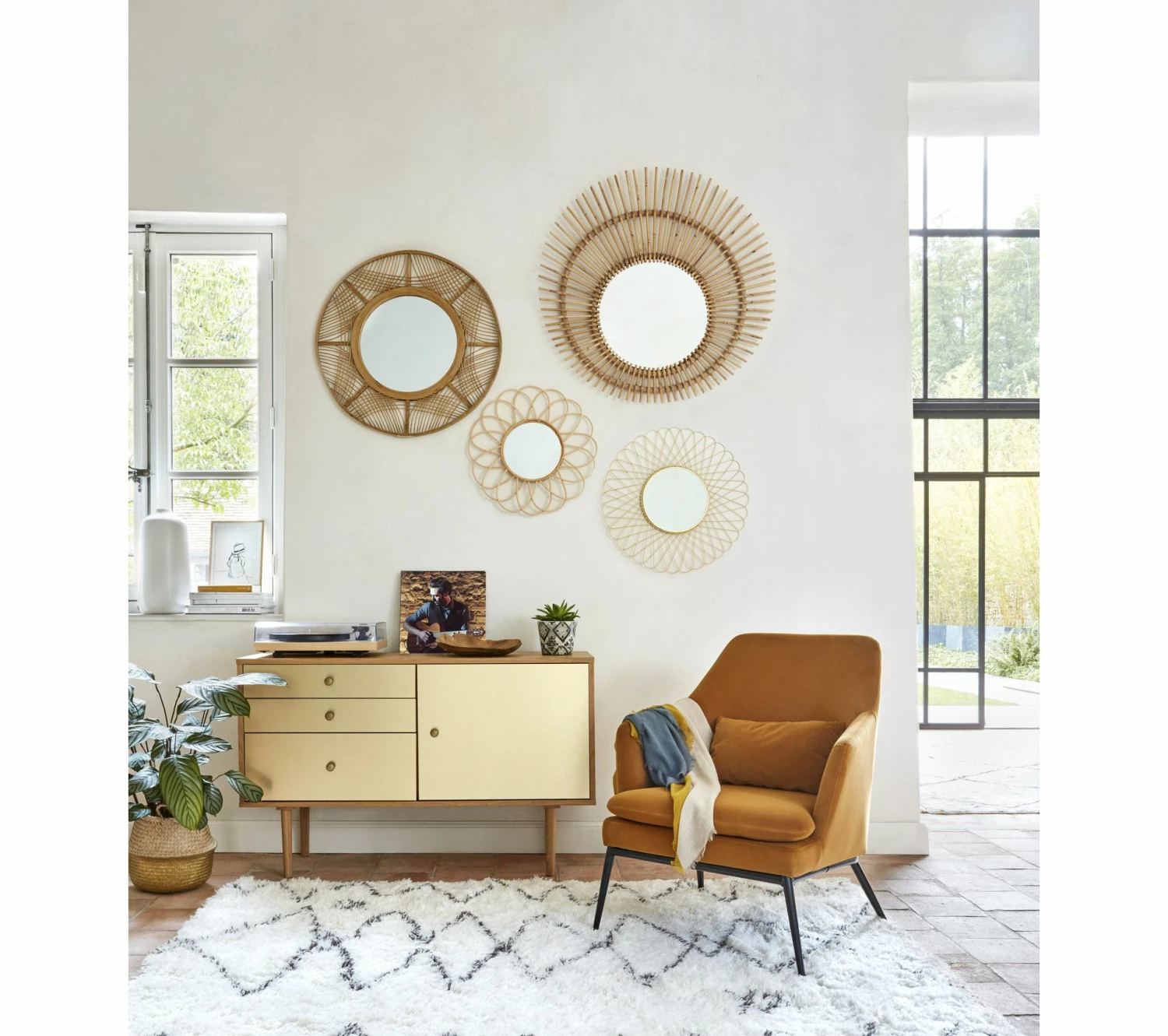 Avec sa finition façon en rosace, le miroir Sol est idéal pour apporter une touche graphique et élégante à votre intérieur. Ce modèle discret et sobre se compose d’une glace d’un diamètre de 19 cm, entourée d’une décoration en fil de fer de couleur noire. Afin de gagner en légèreté, le dos est constitué d’un panneau de fibres de moyenne densité. Ce miroir d’un diamètre total de 48 cm s’accroche au mur grâce à un crochet situé à l’arrière. Un simple clou planté dans la cloison suffit. Il s’entretient aisément à l’aide d’un chiffon en microfibre ou de papier journal roulé en boule.