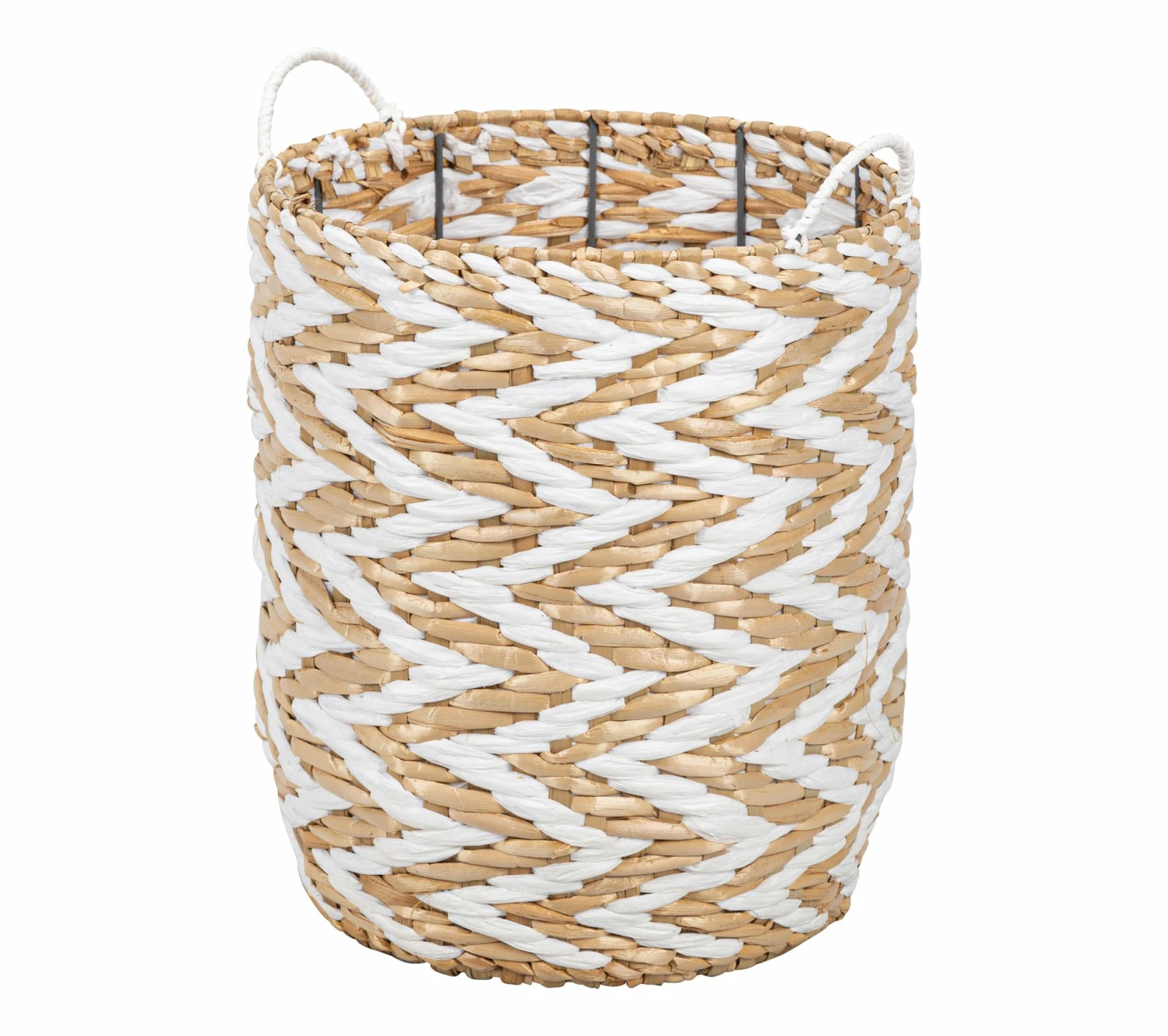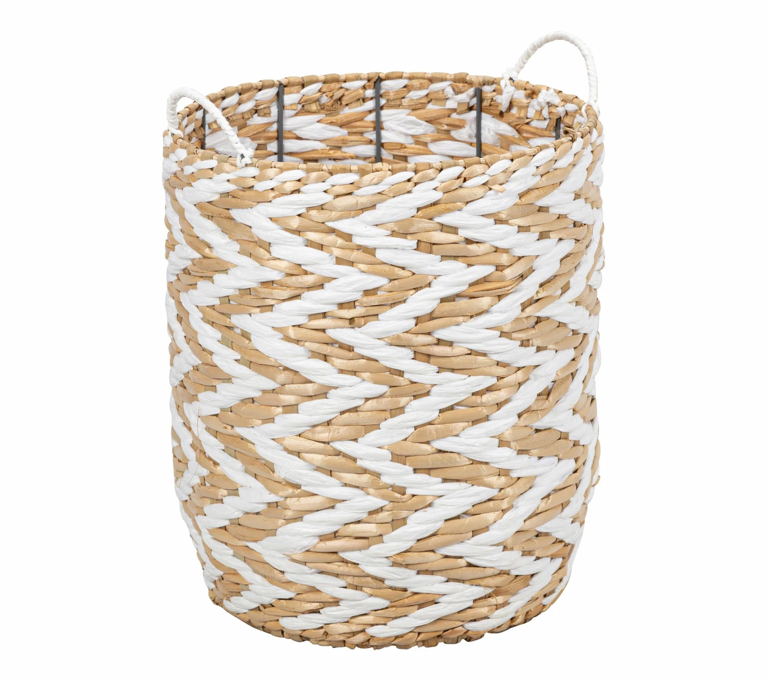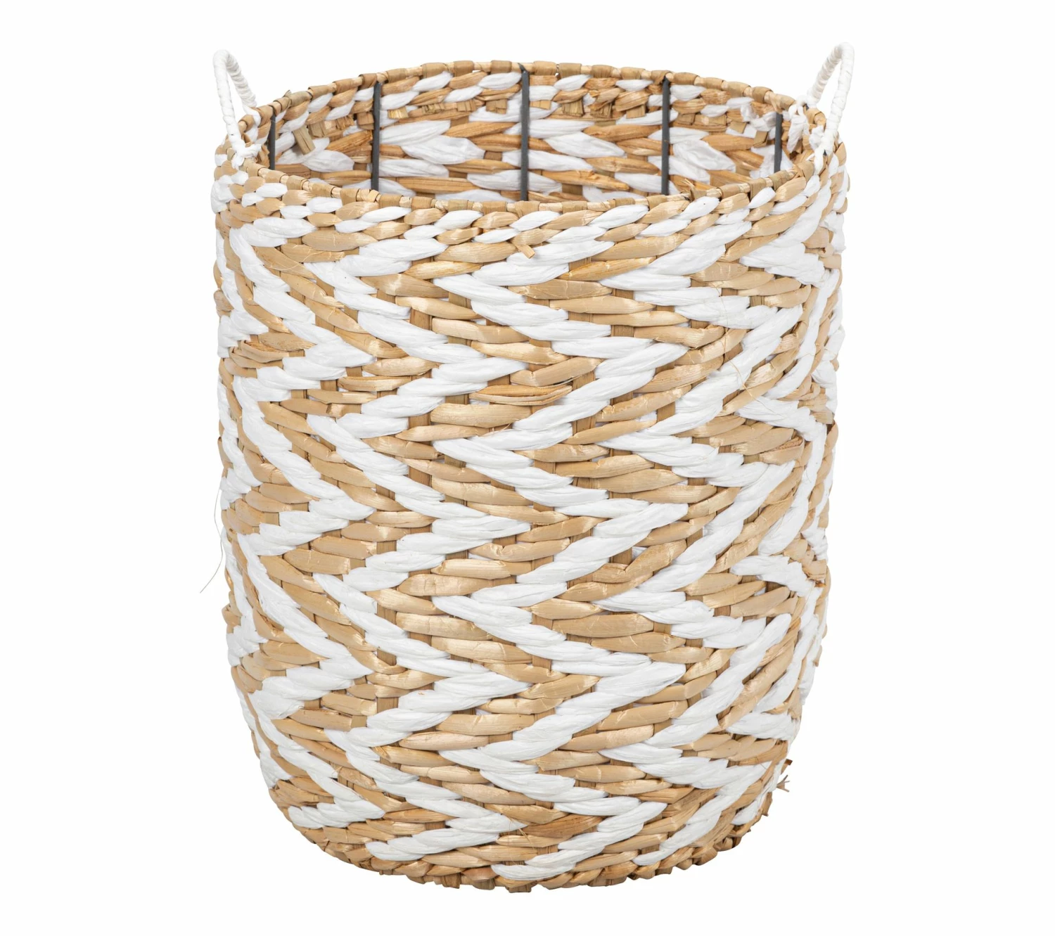 Laissez-vous séduire par ce panier blanc et naturel qui s’habille de motifs d’inspiration ethnique. Il se mariera à merveille avec des éléments naturels pour créer un décor bohème. Entièrement réalisé à la main, ce panier est conçu en jonc et en paille de papier avec une structure en fer.