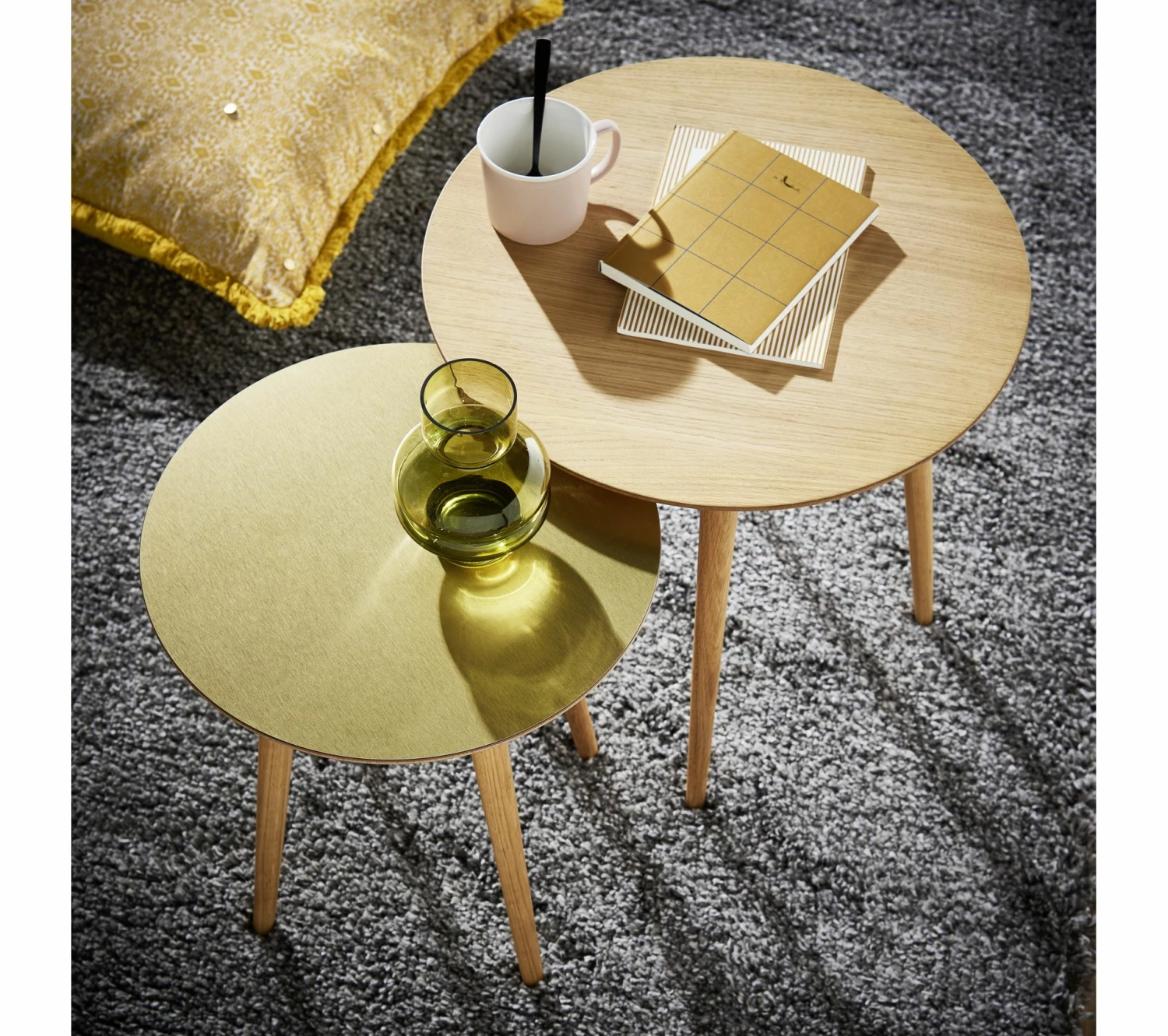 Ces tables basses rondes gigognes chêne et or s’avèrent parfaites pour rejoindre un style de vie un brin bohème ou un décor inspiré de la nature. Elles se marient à merveille à des paniers, des plantes volumineuses, des fauteuils cosy et des tapis à motifs. Un véritable coup de c?ur.