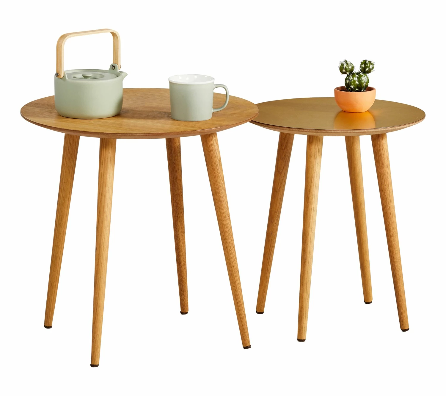 On adore ces tables basses rondes gigognes LOLA TIME, qui viendront sublimer un salon ou une véranda avec brio. Ces tables basses rondes gigognes L. 50 x H. 50 x P. 50 cm et L. 40 x H. 47 x P. 40 cm se composent de deux éléments de tailles différentes, l’un petit, l’autre grand. Ces tables aux plateaux arrondis et aux pieds légèrement évasés peuvent être placées côte à côte ou séparées. On prend soin de ces tables basses rondes gigognes à l’aide d’un chiffon à poussière, tout simplement.
