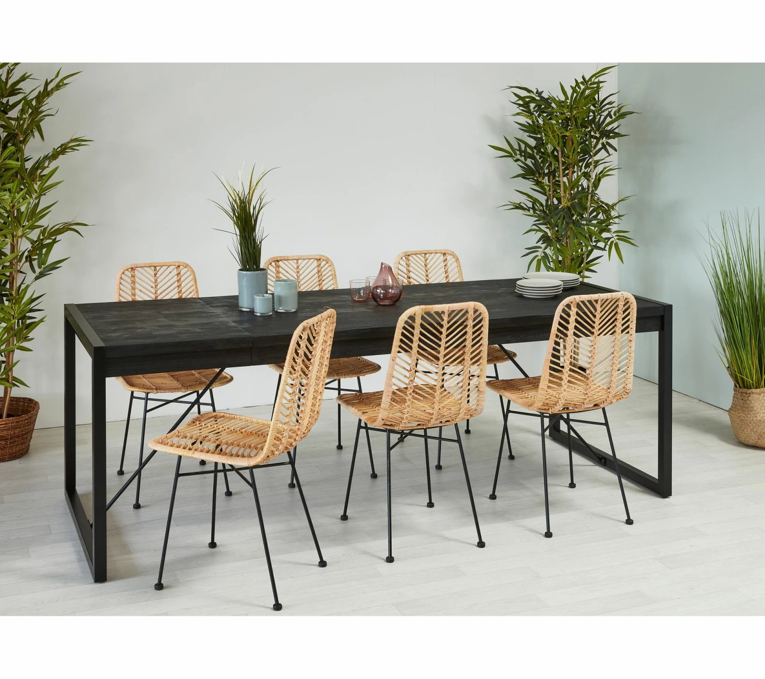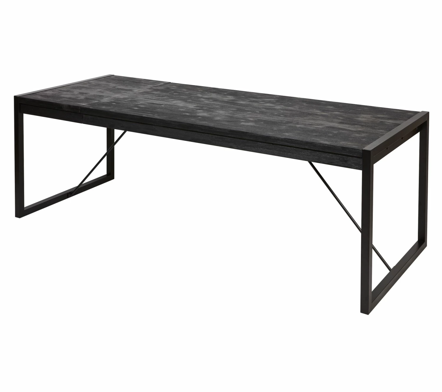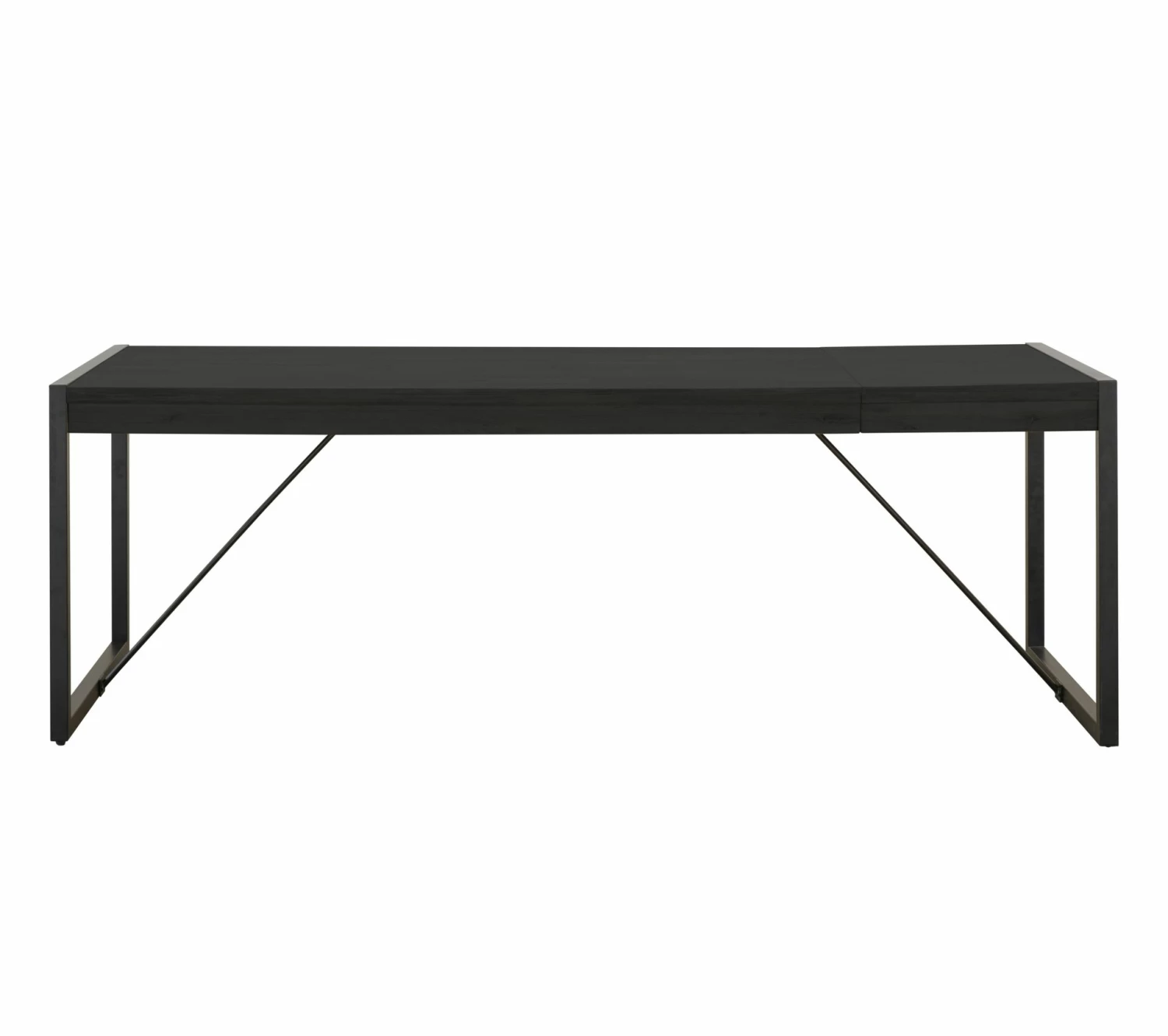 L’alliance du bois d’acacia peint en noir et du piètement métallique confère une touche industrielle à cette table