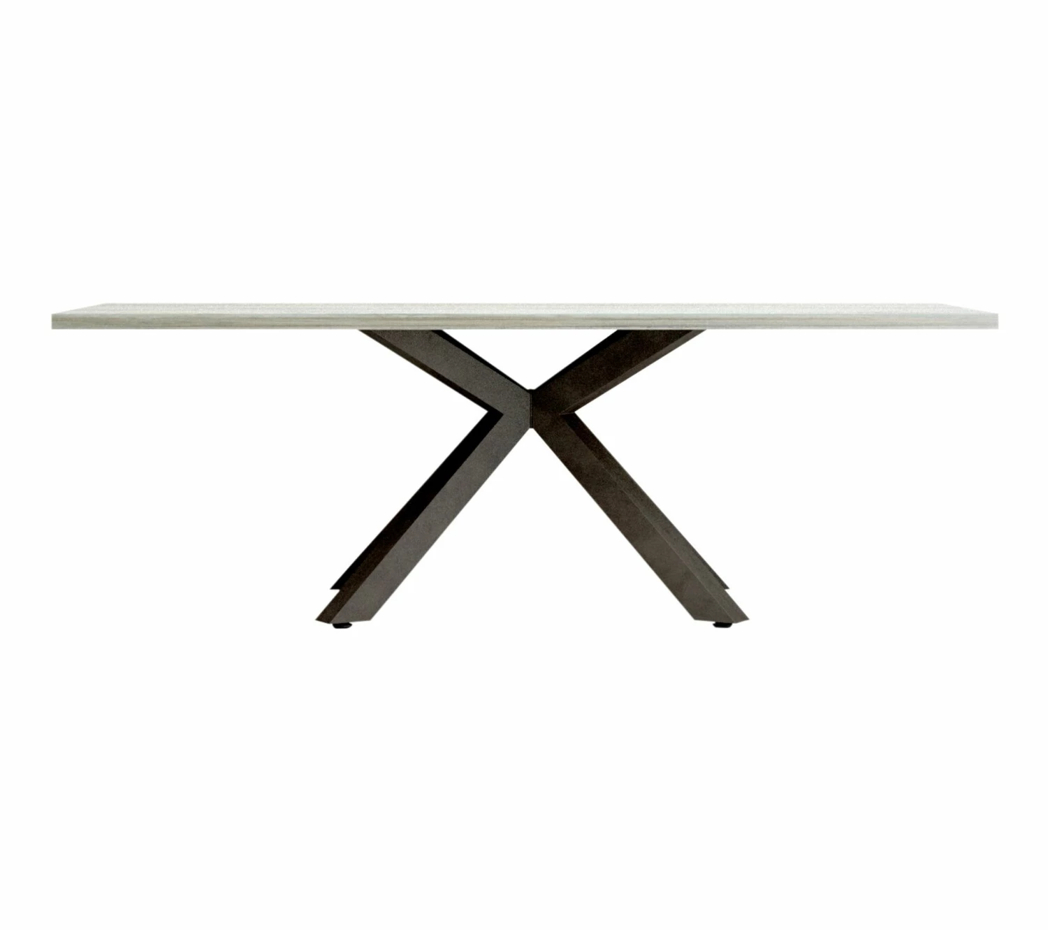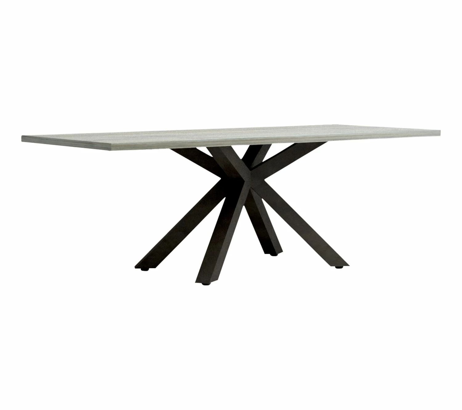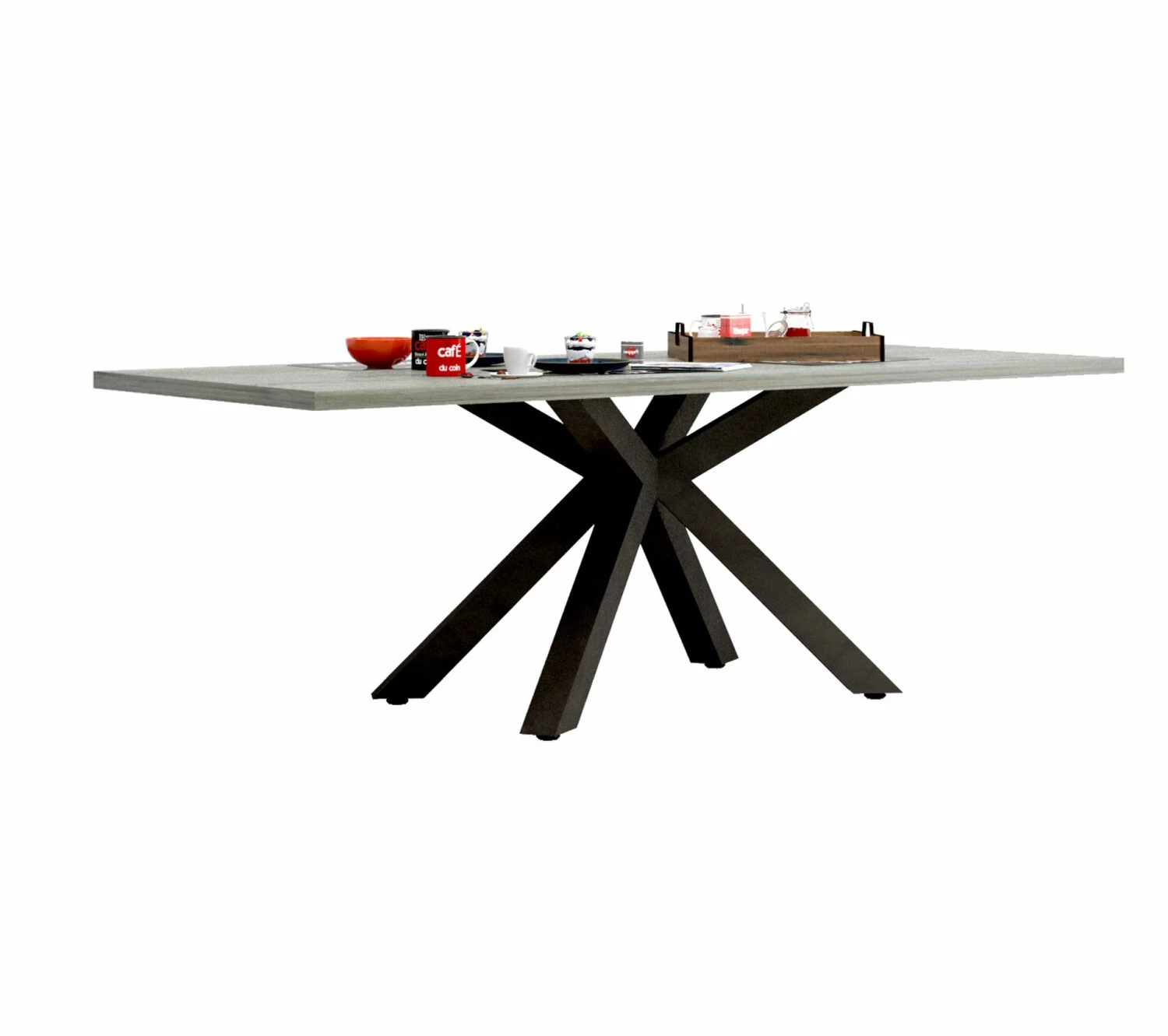 De forme rectangulaire, le plateau de cette table se compose de panneaux de particules revêtus de papier décor imitation chêne gris. Le résultat est très naturel. Quand au contraste avec le pied noir mat, il offre une touche industrielle au design de cette table de 220 cm de long.