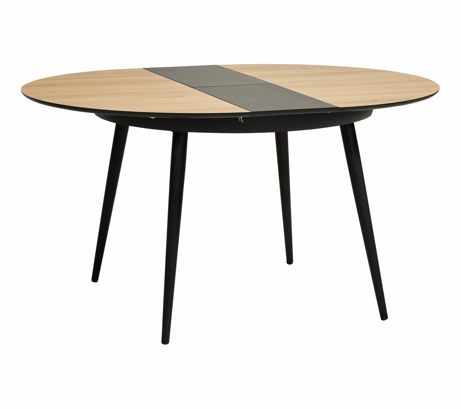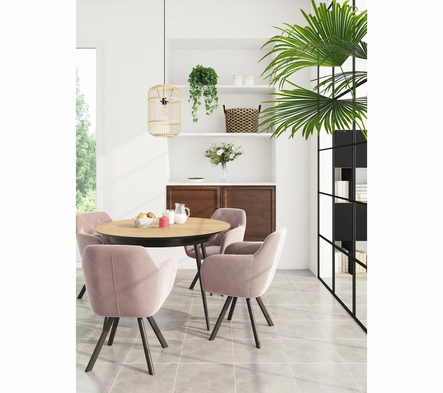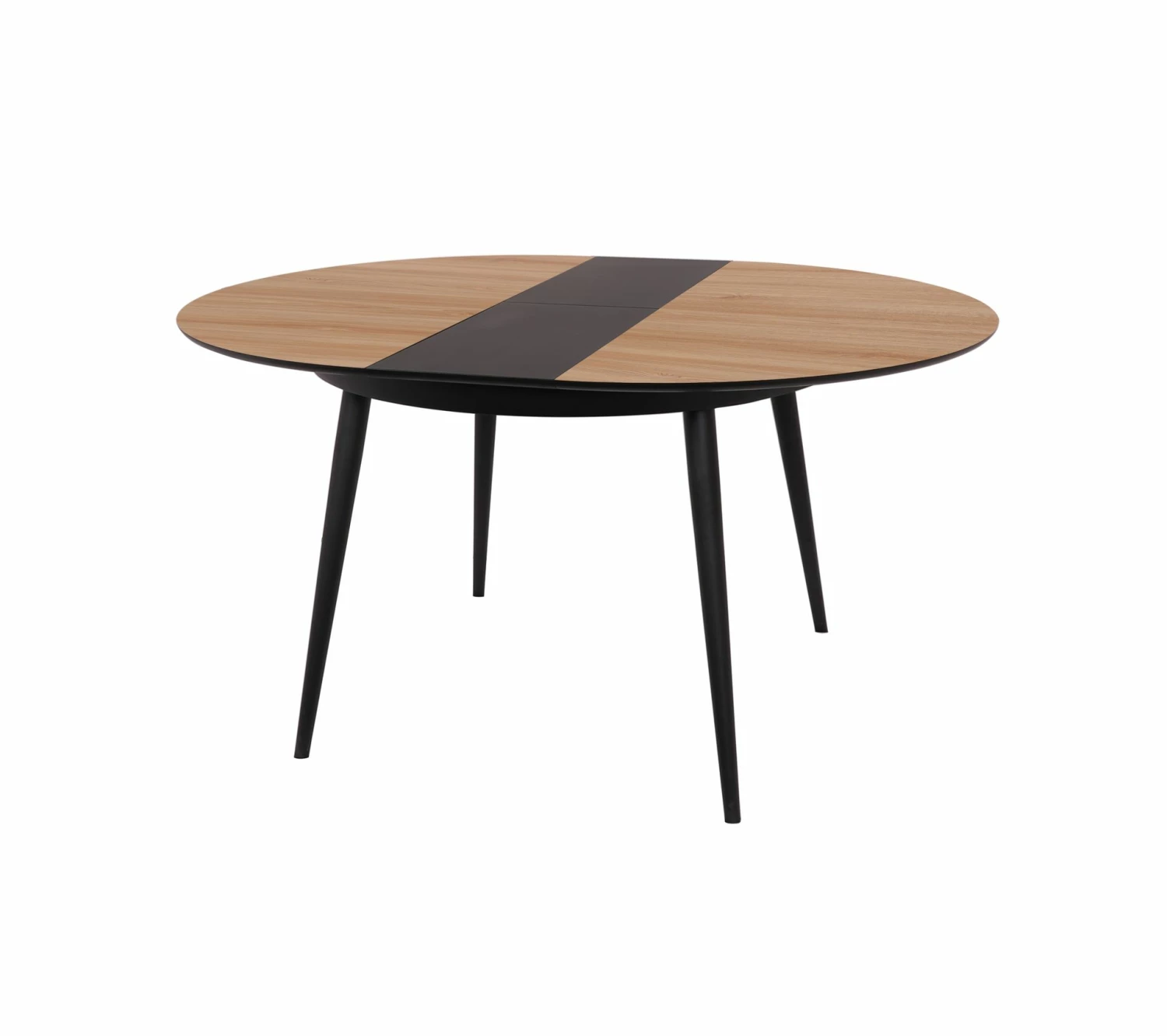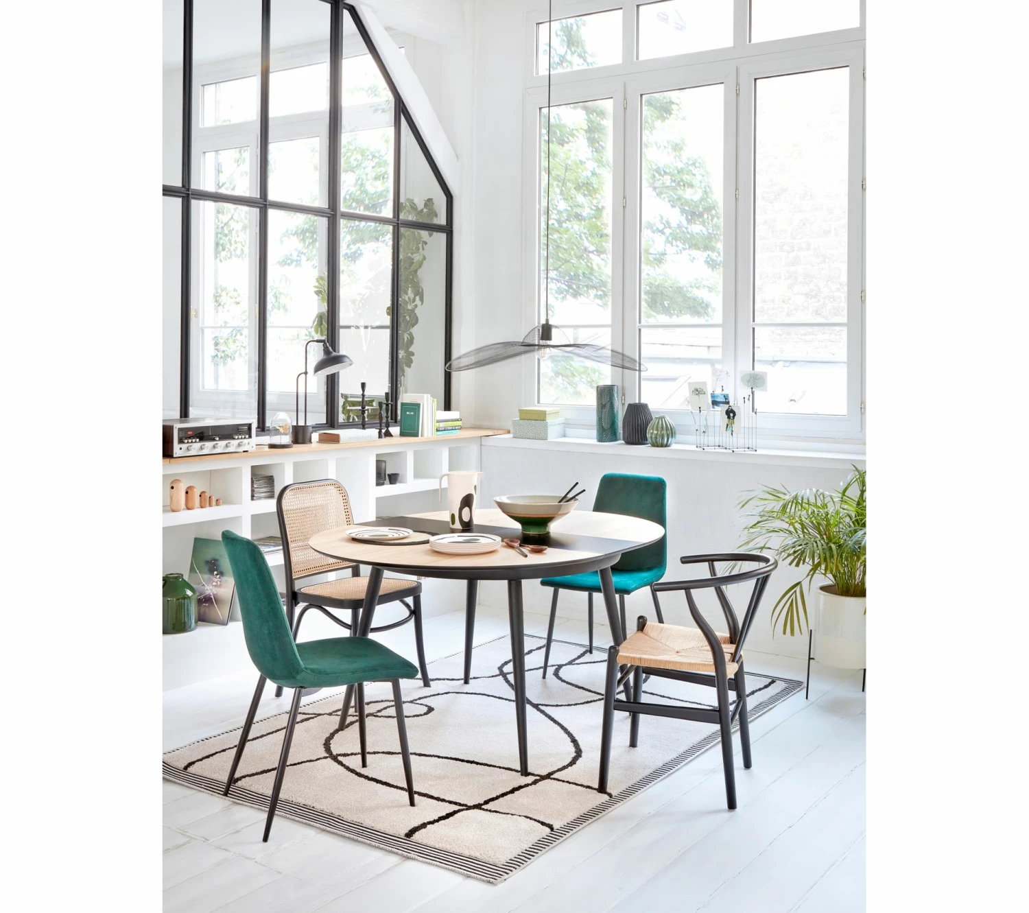 Cette table dotée de pieds de forme compas, présente un style scandinave très contemporain. Vous pourrez compléter la décoration avec un tapis à motifs, des paniers en osier et une suspension en bois. Cette table ronde noire et imitation chêne peut aussi trouver sa place dans un intérieur industriel ou contemporain.